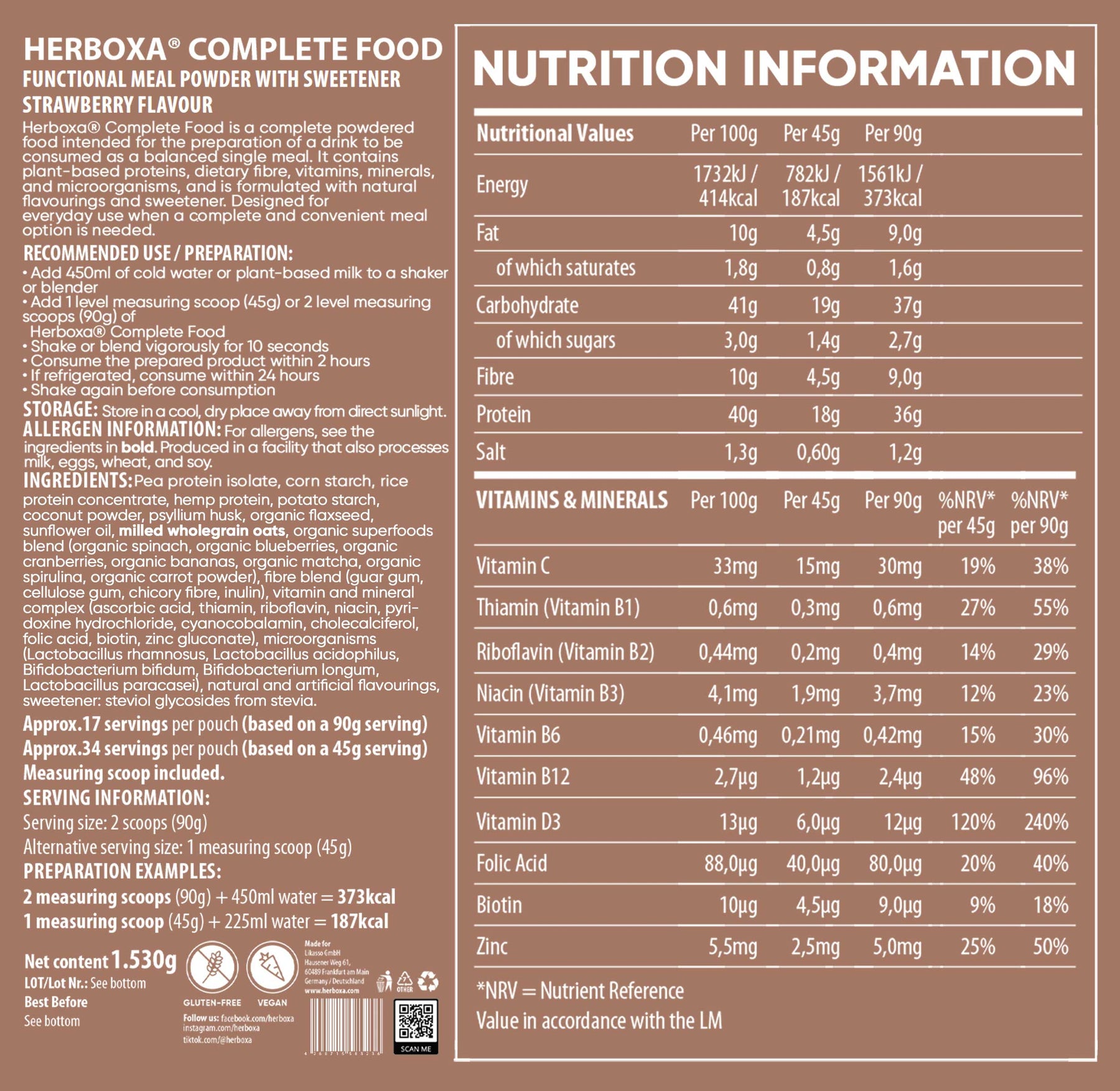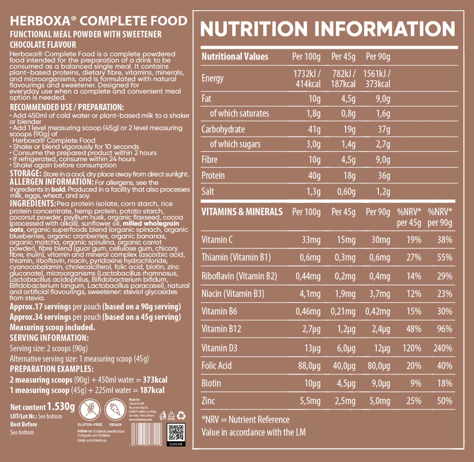 Svaka porcija Herboxe Complete Food od 90 grama pruža 36 grama visokokvalitetnih biljnih proteina dobivenih iz graška i riže, što osigurava zasitan, dobro zaokružen proteinski sastav.