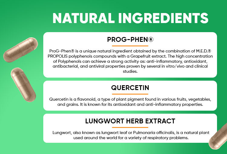 Ekstrakt plućnjaka detoksificira, kvercetin ublažava alergije, a ProG-Phen® suzbija upale. Zajedno nude sigurno i učinkovito rješenje za zdravlje dišnog sustava.